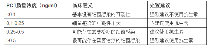 表1:呼吸道感染患者PCT水平的臨床意義和處置建議